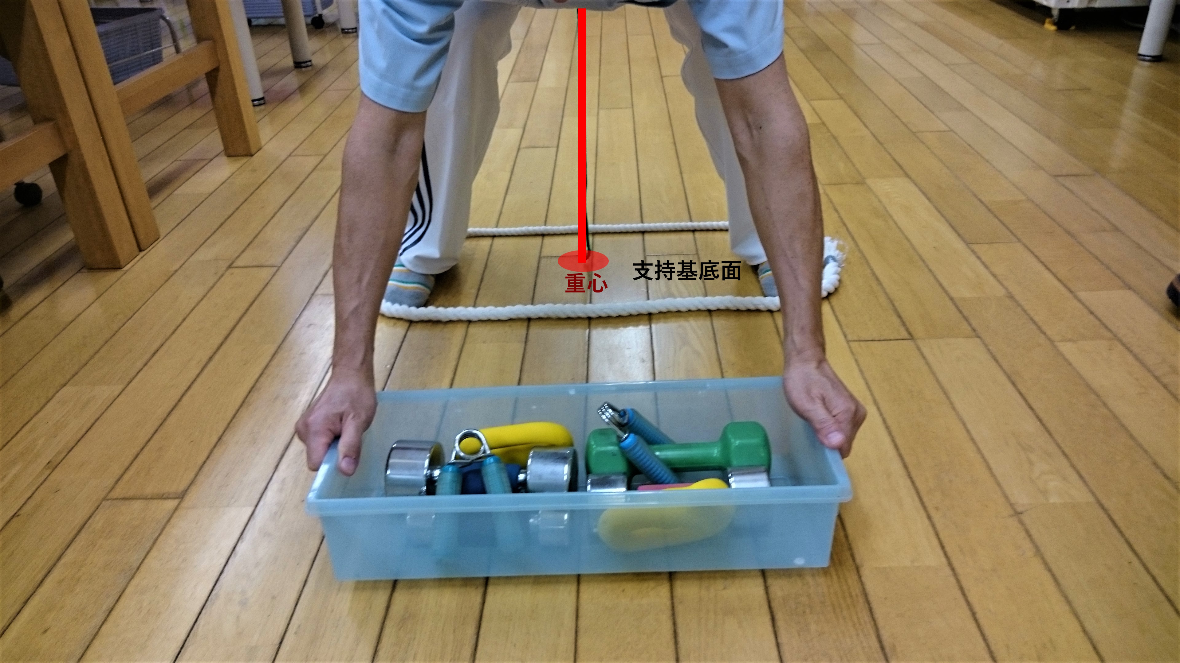 バランスが大きく崩れて支持基底(両足で支えている範囲)だけでは戻せないと判断したら、一歩踏み出して足の位置を変え、支持基底を広げます。新しい足の位置で重心を安全に支えます。