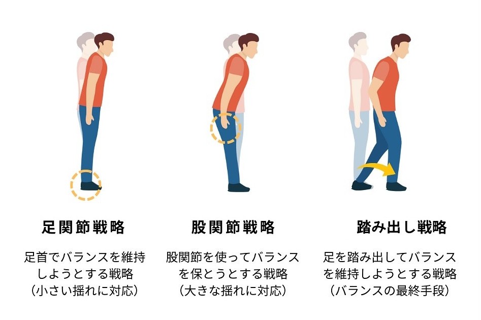 「立位姿勢を維持」するためのそれぞれの戦略は、重心が支持基底面から外れる、または、外れかけたら、「重心を戻す」ための戦略であり、