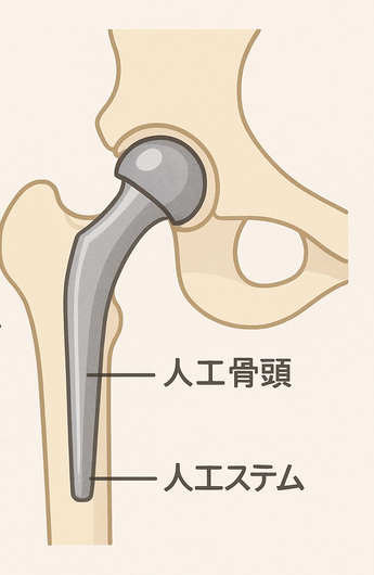 壊れた骨頭を取り除き、金属や樹脂の人工骨頭を入れる。