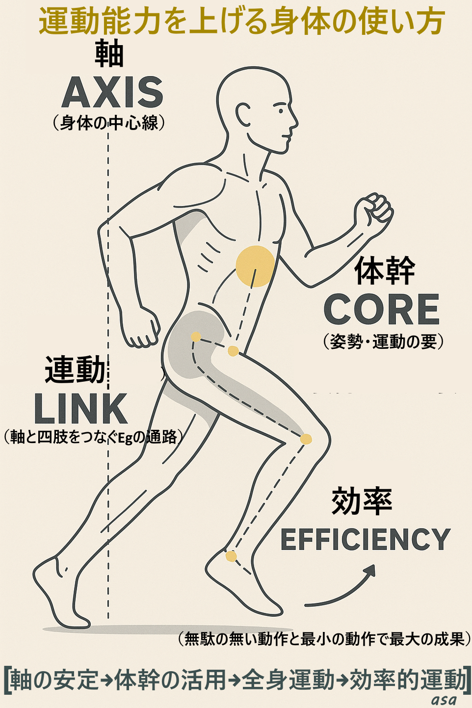 「軸の安定 → 体幹の活用 → 全身連動 → 効率的運動」という、現代スポーツ科学の基本原理