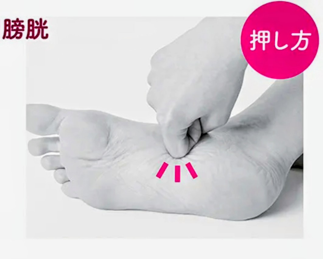 膀胱:親指側面下にある膀胱に人差し指、または中指の第2関節をあて、5秒で押し、5秒でゆるめる。(6~8回)