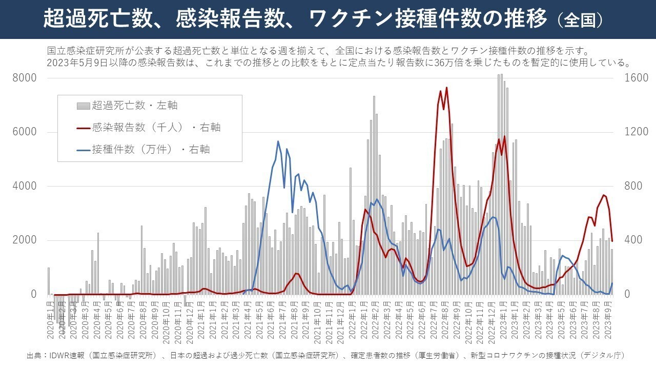 グレーの棒グラフが「超過死亡数」ですが、こちらもほぼほぼワクチン接種・感染者数の波と連動しています。
