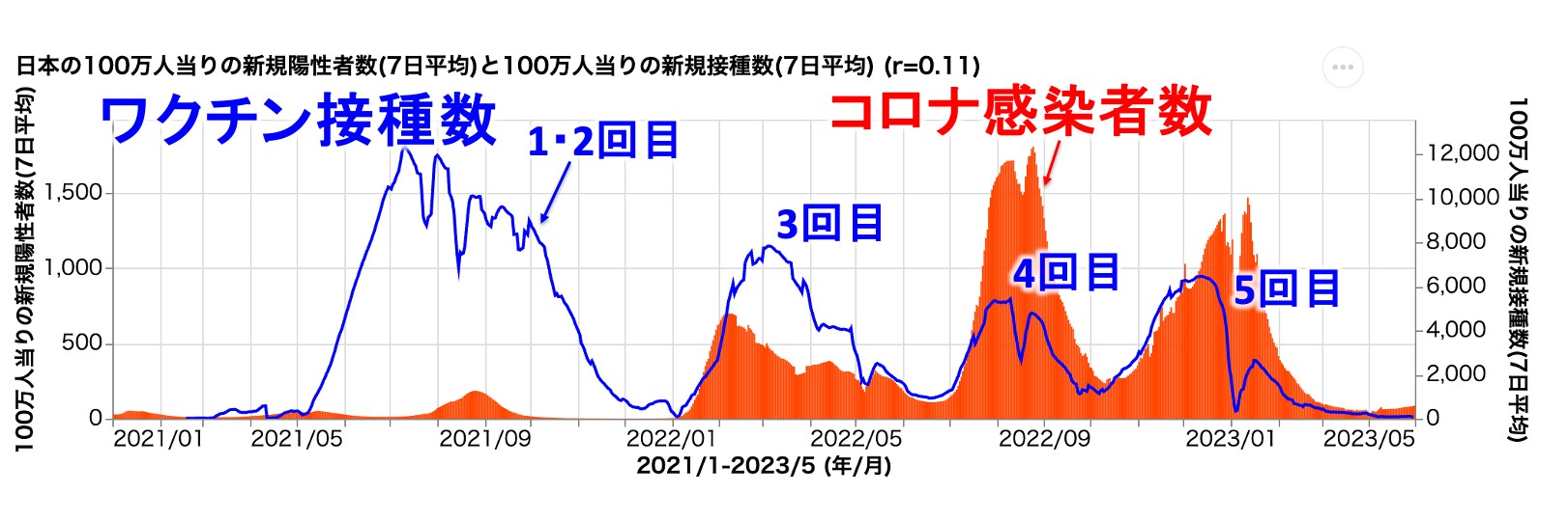 青の波が、「ワクチン接種者数」の波、赤の波が「コロナ感染者数(検査陽性者数)」の波。最初の波以外、ワクチン接種と感染増加の波が完全に一致してしまっています。